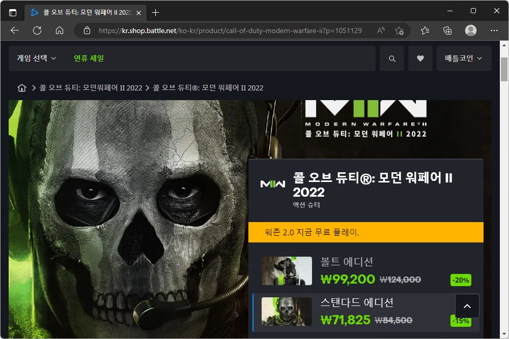 콜 오브 듀티®: 모던 워페어 II 2022의 경우에는 스탠다드 에디션이 71,825원, 볼트 에디션은 99,200원입니다. 볼트 에디션에는 레드 팀 141 오퍼레이터 팩과 FJX 신더 무기 보관함 그리고 배틀 패스 (시즌 1개) 등이 포함되어 있습니다.