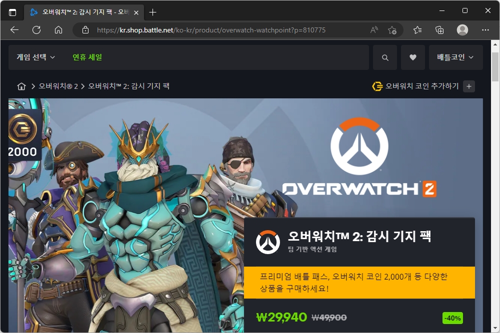 최근에 블리자드에서 공개한 오버워치™ 2: 감시 기지 팩의 경우에는 29,940원에 판매를 하고 있습니다. 참고로 게임 자체는 무료이지만 2시즌 프리미엄 배틀 패스와 전설 스킨 7종 등이 추가되어 있습니다.