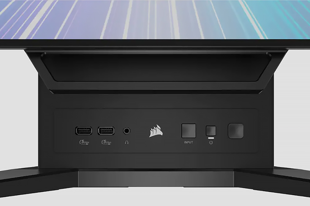 커세어 45WQHD240 OLED 모니터의 전면의 아래쪽에는 2개의 USB 3.2 포트와 3.5mm 오디오 출력 그리고 입력 선택 버튼과 탈착식 레그가 배치되어 있습니다. 마지막으로 손잡이를 이용해서 22도로 틸트를 할 수 있습니다.