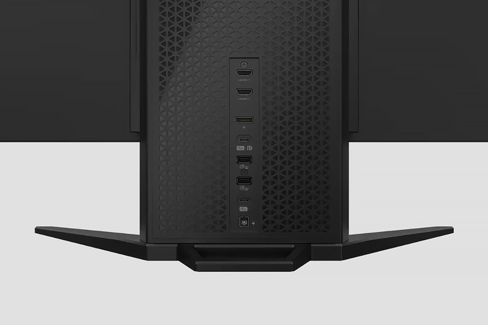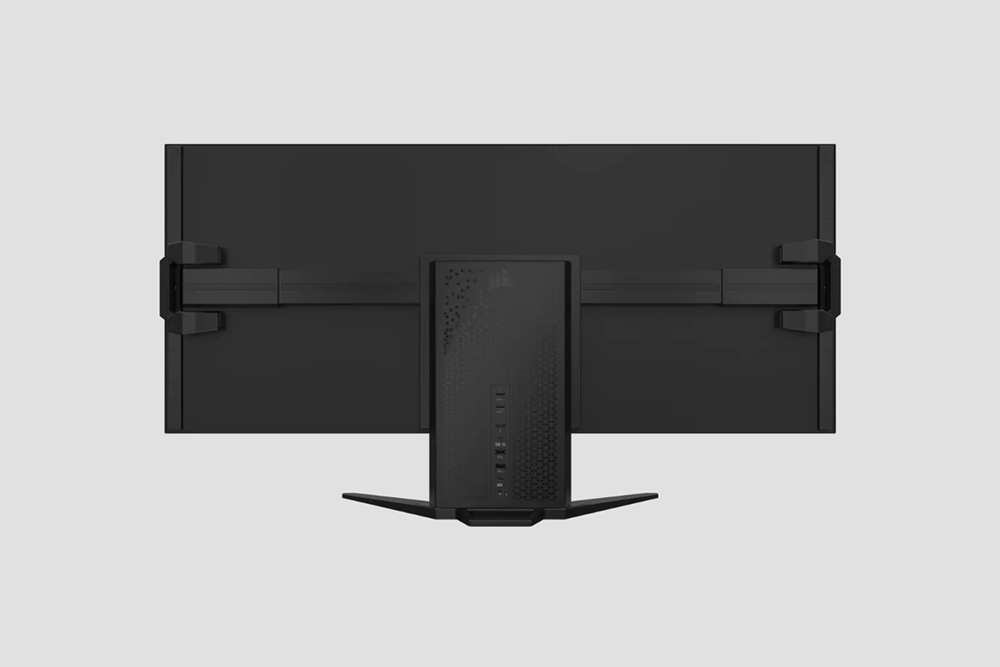 커세어 45WQHD240 OLED 모니터의 뒷면을 살펴보면 일반적인 게임용 모니터와는 다르게 벤딩을 할 수 있는 별도의 부품들이 준비된 것을 확인할 수 있습니다. 그리고 아래쪽에는 2개의 HDMI 2.1과 1개의 DISPLAYPORT 1.4 그리고 USB 타입C와 2개의 USB 3.2 포트 등이 배치되어 있습니다.