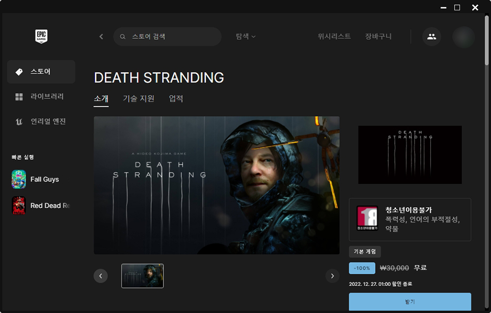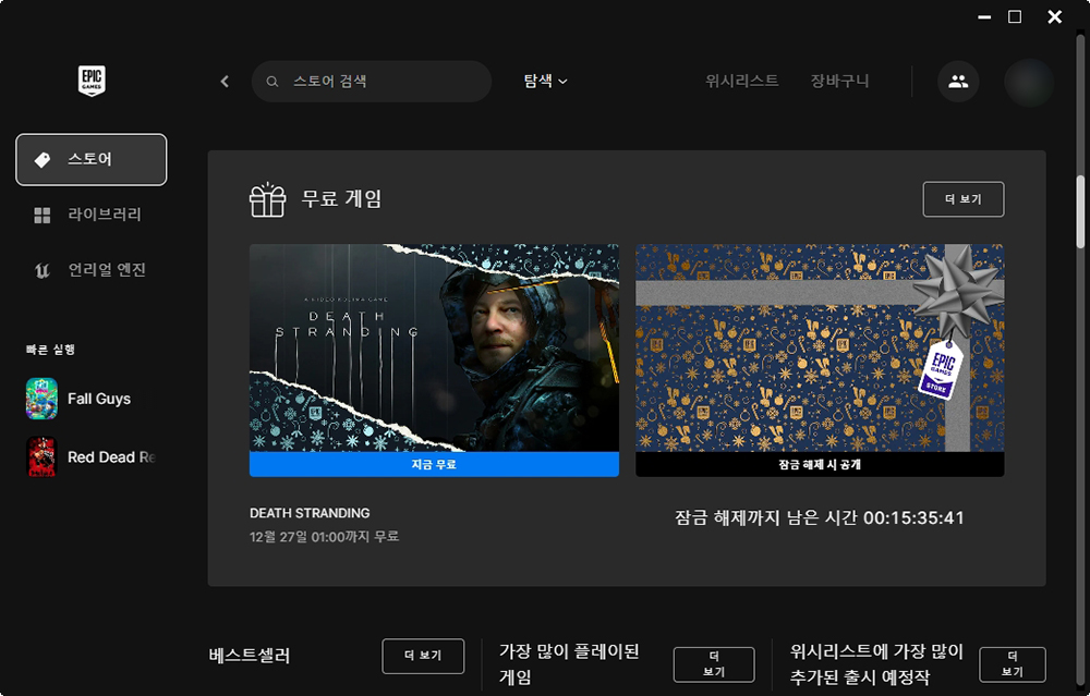 우선 에픽게임즈 런처를 실행시키면 현재 홀리데이 세일이 진행되고 있고 상품권도 자동으로 증정된 상태라는 것을 확인할 수 있습니다. 그리고 중간 정도를 확인해 보면 데스 스트랜딩이 무료로 제공되고 있습니다.