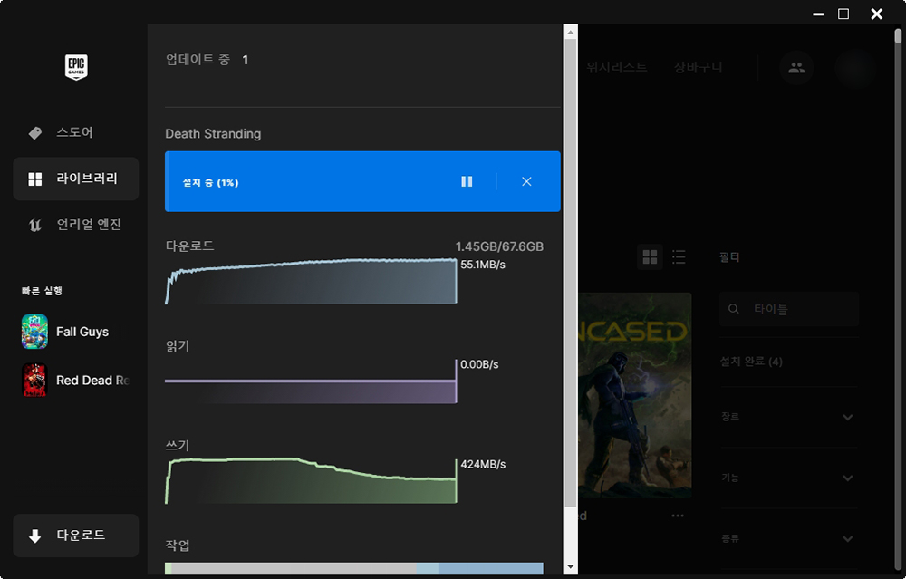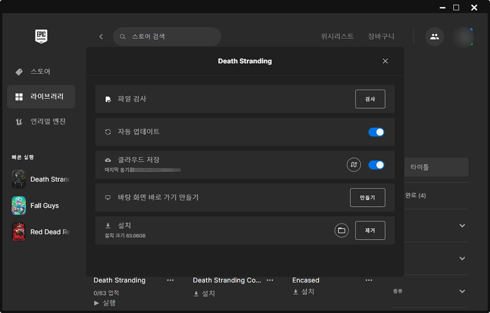 에픽게임즈의 다운로드 속도는 상당히 빠른 편입니다. 그리고 데스 스트랜딩을 다운로드하면 67.6GB를 내려받고 실제로 설치 용량은 63.06GB인 것을 확인할 수 있습니다. 크게 부담이 되는 용량은 아니라고 할 수 있습니다.