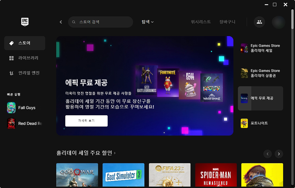 우선 에픽게임즈 런처를 실행시키면 현재 홀리데이 세일이 진행되고 있고 상품권도 자동으로 증정된 상태라는 것을 확인할 수 있습니다. 그리고 중간 정도를 확인해 보면 데스 스트랜딩이 무료로 제공되고 있습니다.