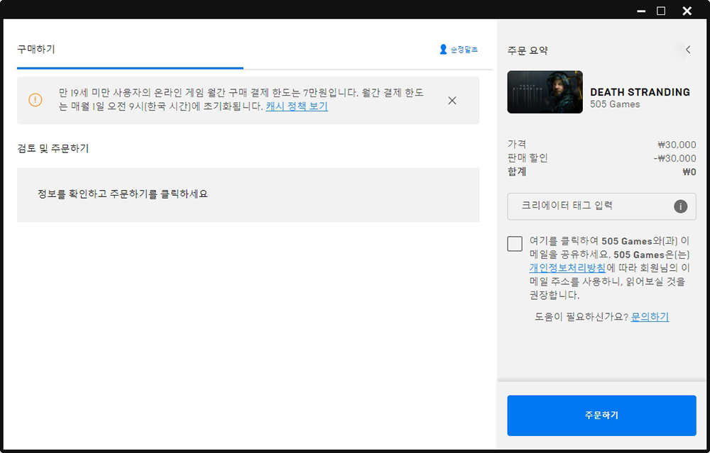 받기를 선택하면 주문하기 메뉴로 들어가고 유통사인 505 게임즈와 이메일 주소를 공유할 것인지를 물어보는 체크표시가 있습니다. 가능하면 선택하지 않는 것을 추천합니다. 그리고 라이브러리를 확인해 보면 DEATH STRANDING과 DEATH STRANDING CONTENS가 추가된 것을 확인할 수 있습니다. 참고로 몇몇 콘텐츠들이 추가된 디렉터스 컷의 경우에도 6,600원에 구매를 할 수 있습니다.
