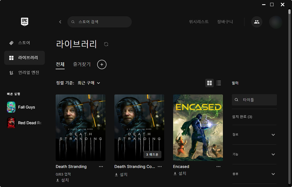 에픽게임즈의 다운로드 속도는 상당히 빠른 편입니다. 그리고 데스 스트랜딩을 다운로드하면 67.6GB를 내려받고 실제로 설치 용량은 63.06GB인 것을 확인할 수 있습니다. 크게 부담이 되는 용량은 아니라고 할 수 있습니다.