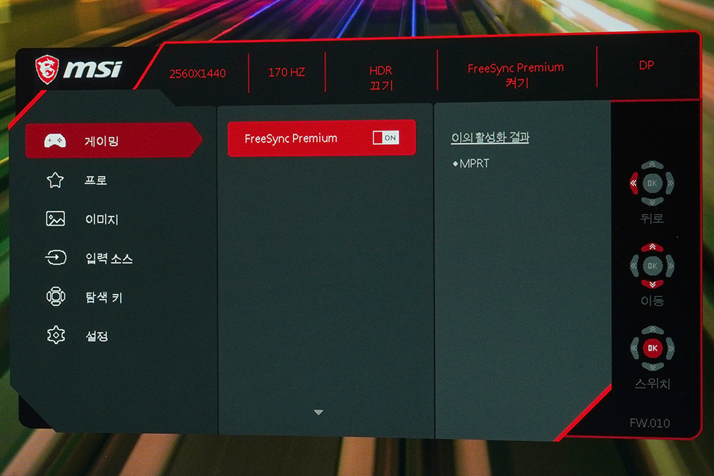 그리고 MSI G322CQP 게이밍 모니터의 OSD 기능 중에서 편리하다고 생각했던 부분은 어떤 옵션을 켜면 다른 설정들이 비활성화되는지를 확인할 수 있다는 점입니다. 메뉴 자체가 상당히 직관적이라는 인상을 받았습니다. 참고로 FreeSync Premium 기능을 켜야지만 어댑티브 싱크 기능을 사용할 수 있습니다.