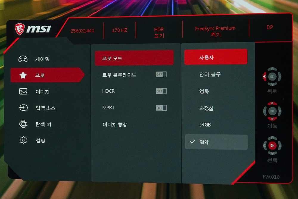 프로를 살펴보면 프로 모드를 변경하거나 로우 블루라이트 그리고 HDCR이나 MPRT와 같은 기능들을 켜고 끌 수 있도록 준비되어 있습니다. 상황에 따라서 활용해주는 것이 좋을 것 같습니다.