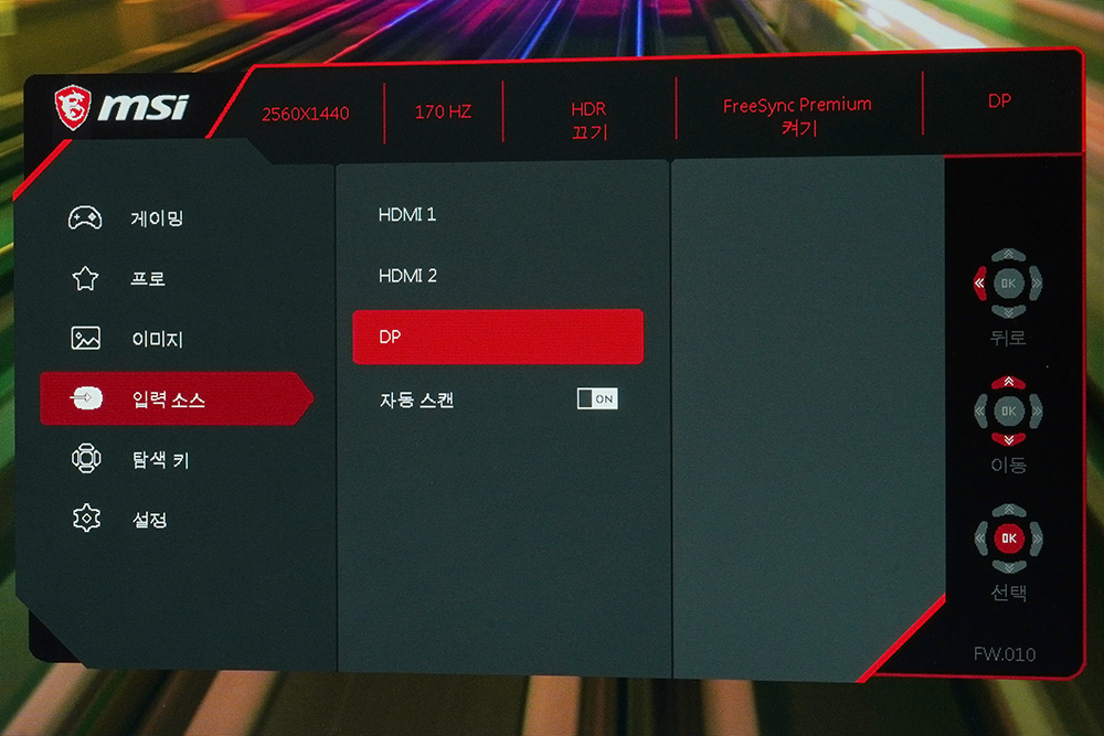 이미지에서는 밝기나 명암을 변경할 수 있고 선명도, 색온도, 화면 크기도 변경할 수 있습니다. 그리고 입력 소스 메뉴에서는 HDMI 1, 2나 DP로 입력 신호를 전환할 수 있고 자동 스캔 기능도 지원합니다.