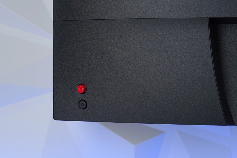 뒷면의 왼쪽 아래에는 레드 컬러로 마무리된 탐색 키와 전원 버튼이 배치되어 있습니다. 전면에서 바라보았을 때 오른손으로 조작하도록 설계되어 있고 5방향 OSD 네비게이션 조이스틱으로 제작되어서 편리하게 활용할 수 있습니다.