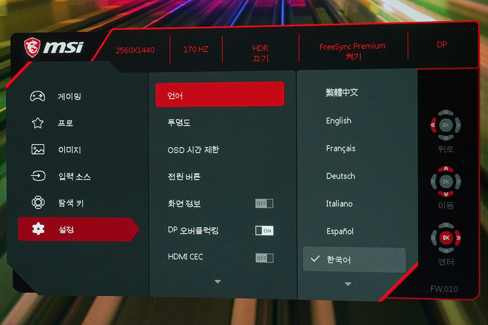 그리고 탐색 키에서는 조이스틱의 4방향에 자신이 자주 사용하는 기능들을 설정할 수 있고 설정에서는 언어를 변경하거나 DP 오버클럭킹을 켤 수 있는 메뉴들이 준비되어 있습니다.