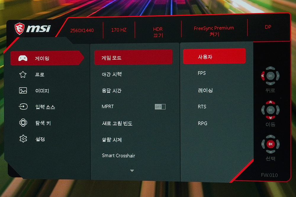조이스틱을 누르면 OSD 메뉴가 실행되는데요. 상단에는 각종 정보가 표시되고 게이밍에서는 게임 모드나 야간 시력 그리고 다양한 게임 관련 기능들을 변경하고 실행할 수 있습니다.