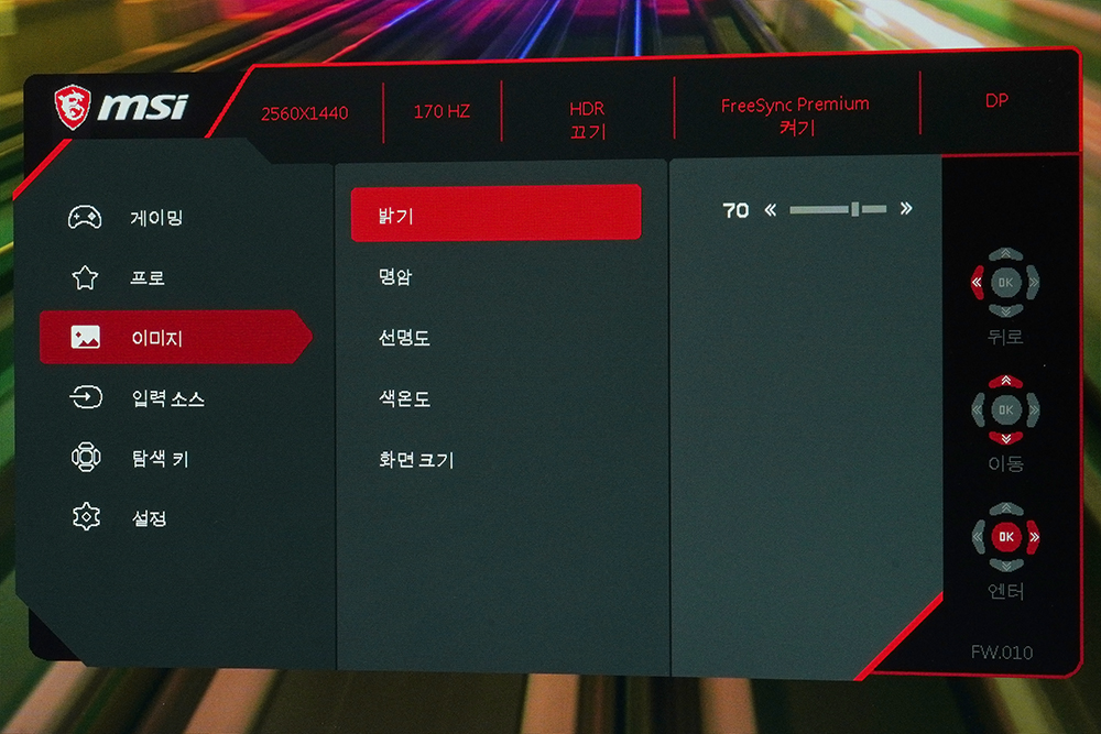 조이스틱을 누르면 OSD 메뉴가 실행되는데요. 상단에는 각종 정보가 표시되고 게이밍에서는 게임 모드나 야간 시력 그리고 다양한 게임 관련 기능들을 변경하고 실행할 수 있습니다.