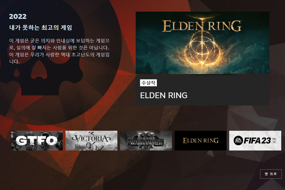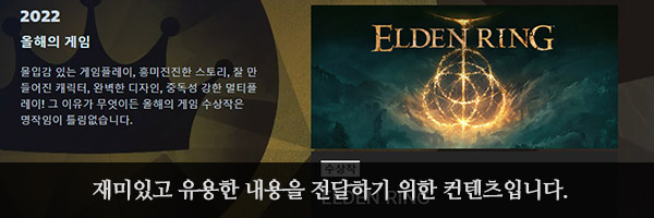 2022 내가 못하는 최고의 게임은 엘든 링 (ELDEN RING)이 차지했습니다. 참고로 제작사인 프롬 소프트는 다크 소울과 세키로: 섀도우 다이 트와이스와 같은 걸출한 게임들을 개발했습니다.