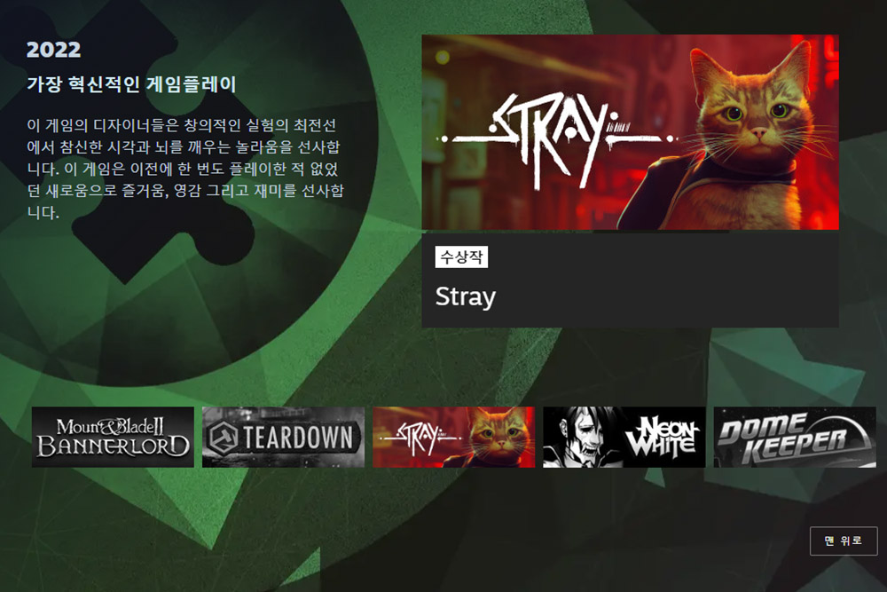 2022 가장 혁신적인 게임플레이는 BlueTwelve Studio의 스트레이 (Stray)가 선정되었습니다. 실제로 고양이가 된 것과 같은 다양한 상호작용과 퍼즐을 인상적이라는 평가를 받고 있습니다.