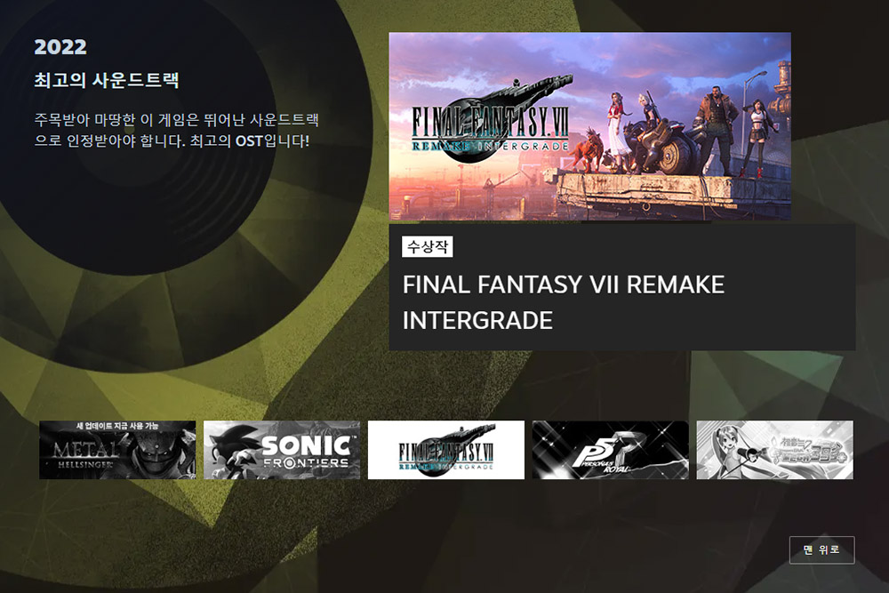 2022 최고의 사운드트랙은 스퀘어 에닉스의 파이널 판타지 Ⅶ 리메이크 인터그레이드가 선정되었습니다. 아재 게이머들에게는 추억의 게임이라고 할 수 있고 무난하게 잘 뽑혔다는 평가를 받았습니다.