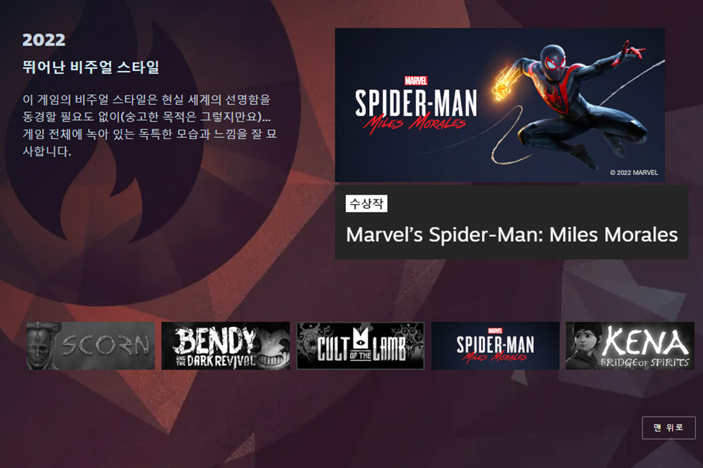 2022 뛰어난 비주얼 스타일의 경우에는 인섬니악 게임즈의 Marvel's Spider-Man: Miles Morales가 선정되었습니다. 상의 이름에서도 알 수 있듯이 수려해진 그래픽이 강점인 게임입니다.