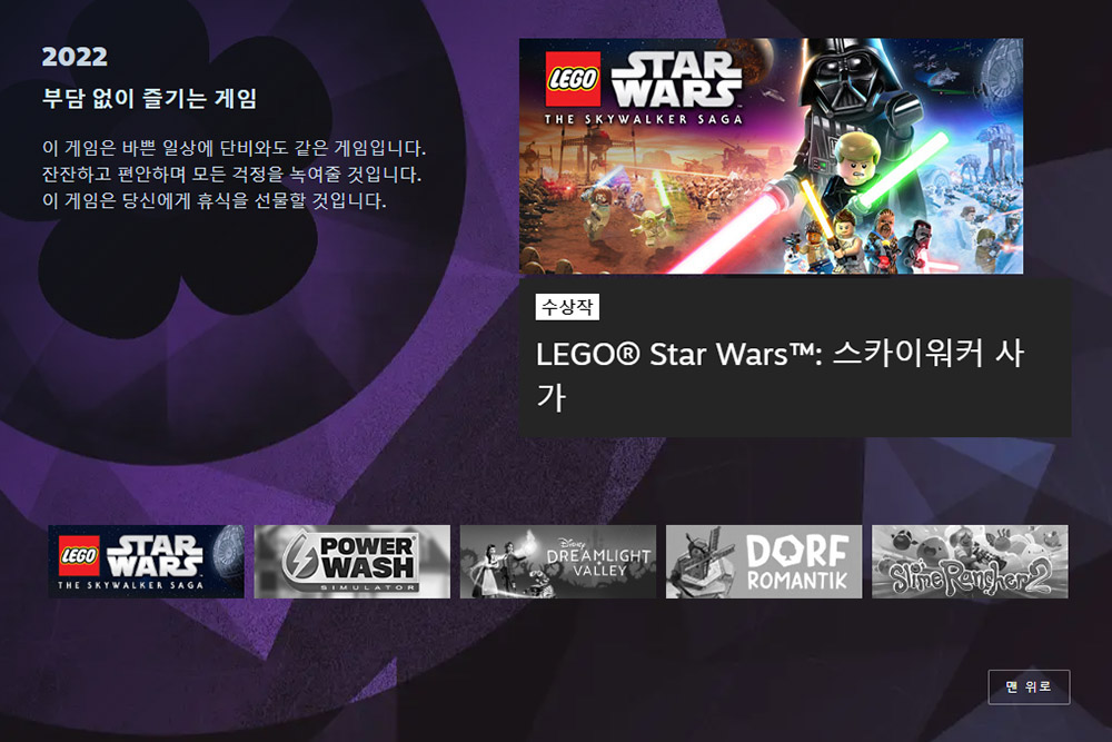 2022 부담 없이 즐기는 게임은 Tt Games의 레고 스타워즈: 스카이워커 사가가 선정되었습니다. 은근히 레고 게임들의 평가가 좋은 편이고 귀여운 편이서 부담 없이 플레이할 수 있다는 장점이 있습니다.