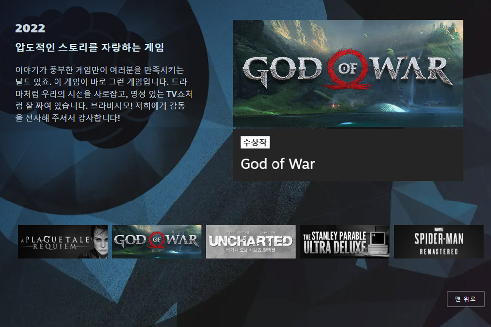 2022 압도적인 스토리를 자랑하는 게임은 SIE 산타 모니카 스튜디오의 갓 오브 워(God of War)가 선정되었습니다. 액션 어드벤처 게임으로 그래픽과 스토리 그리고 전투 시스템까지 상당히 밸런스가 좋다는 평가를 받았습니다.