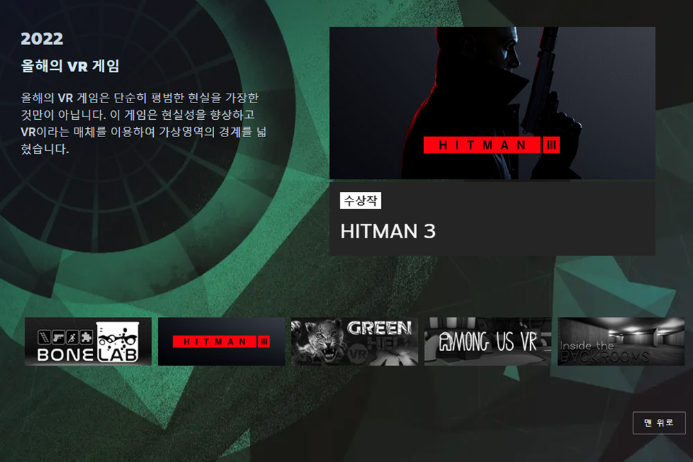 2022 올해의 VR 게임은 IO 인터랙티브의 히트맨 3 (HITMAN 3)입니다. 장르는 3인치 전략 암살 게임이고 최근 오큘러스 퀘스트2와 같은 가성비 좋은 제품들이 출시되기 시작하면서 몰입감 높은 VR 게임에 대한 사람들의 관심이 높아지고 있습니다.