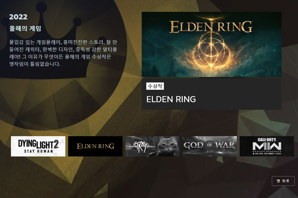 2022 올해의 게임 수상작은 프롬 소프트웨어의 엘든 링 (ELDEN RING)입니다. 3인치 오픈 월드 게임으로 왕좌의 게임의 조지 R.R. 마틴이 작가로 참여해서 흥미진진한 세계관을 만들어냈다는 평가를 받고 있습니다. 그리고 게임 플레이 자체는 어려운 편이지만 그만큼 도전 의식을 끌어내고 있습니다.