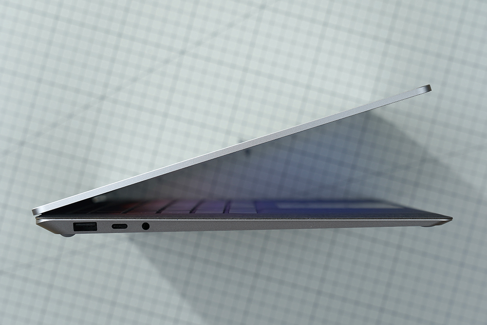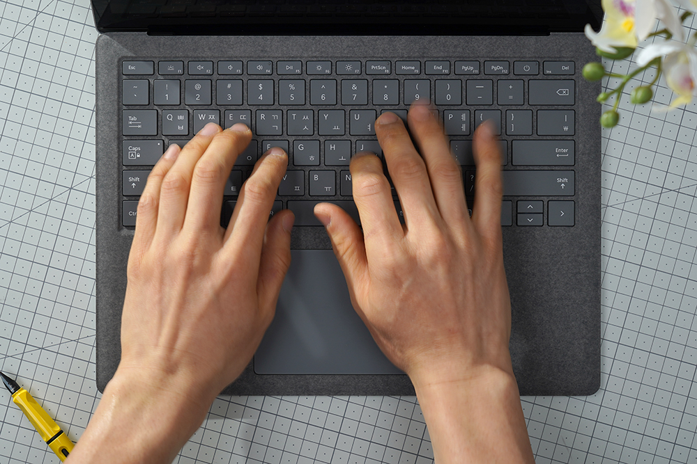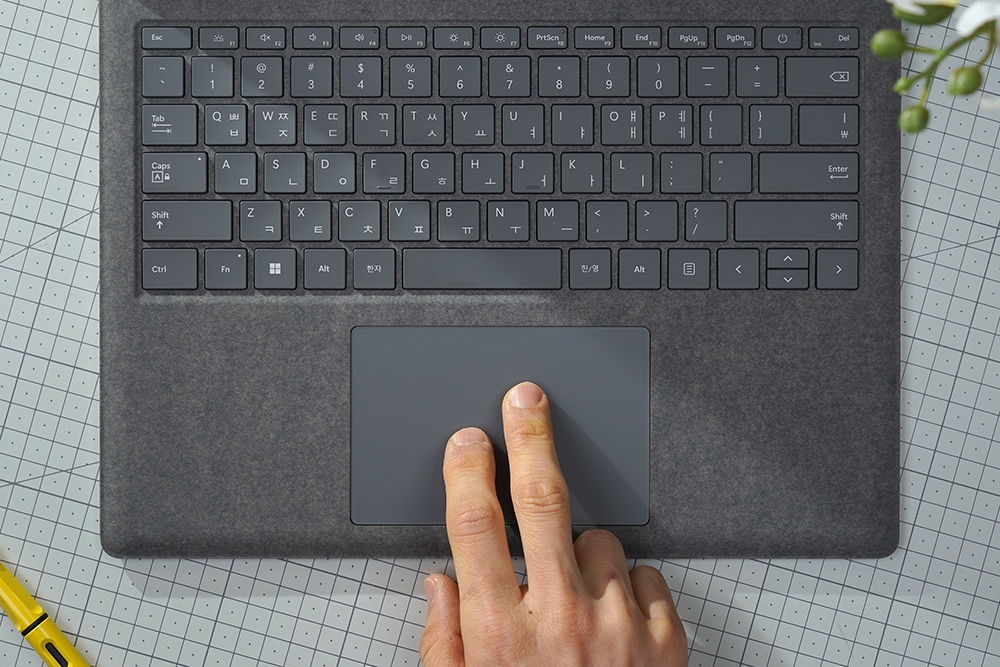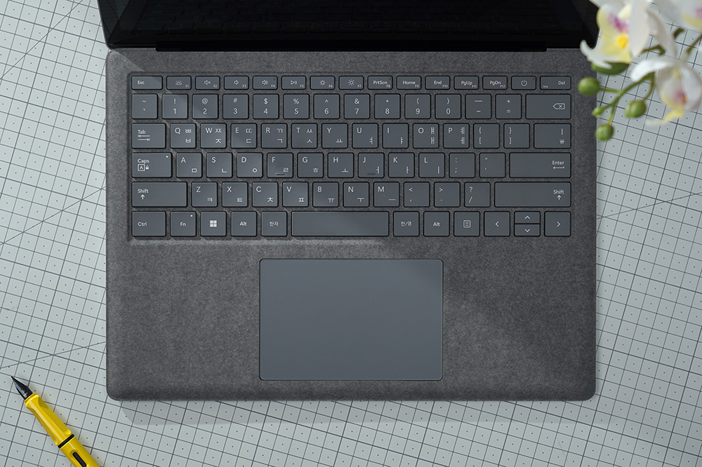 마이크로소프트 서피스 랩탑5의 키보드는 알칸테라(Alcantara) 소재로 마무리되었습니다. 부드러운 느낌을 제공한다는 장점이 있지만 사용자에 따라서 호불호가 갈릴 수 있습니다. 그리고 야간에도 작업을 할 수 있도록 키보드에는 백라이트가 탑재되었습니다.