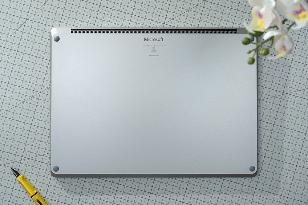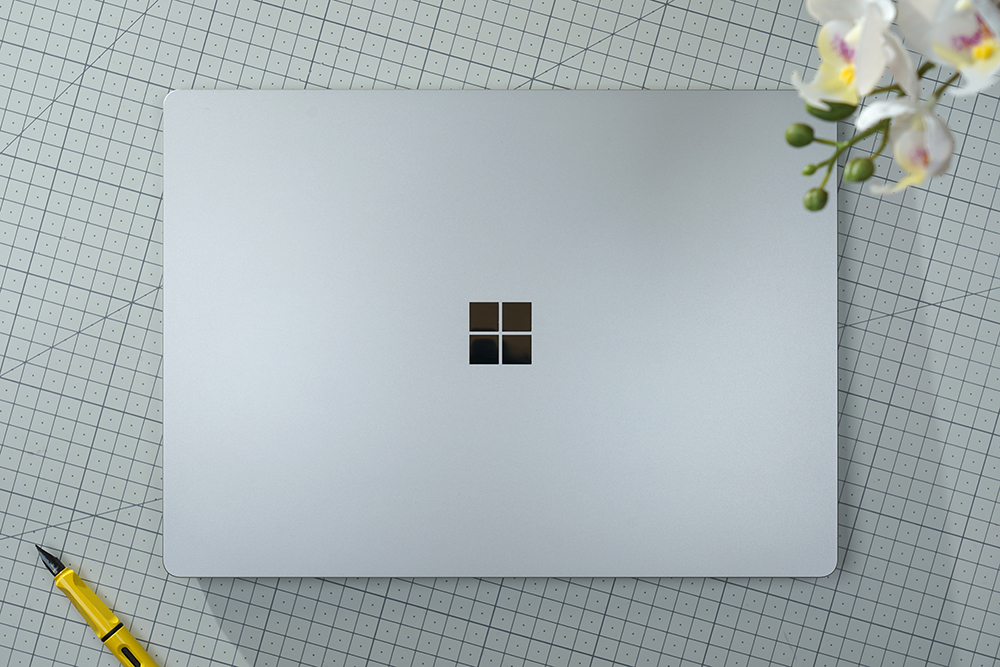 마이크로소프트 서피스 랩탑5의 케이스는 알루미늄으로 제작되었고 색상은 플래티넘으로 마무리되었습니다. 그리고 중앙에는 로고가 배치되어 있는데요. 디자인적인 완성도가 상당히 높은 편이라고 생각되었습니다.