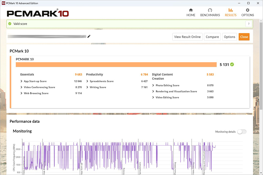 마지막으로 노트북의 전반적인 성능을 평가해주는 PCMARK10의 점수는 5131점으로 측정되었습니다. 12세대 인텔® 코어™ 프로세서를 탑재해서 준수한 성능을 보여준다고 판단되었습니다.