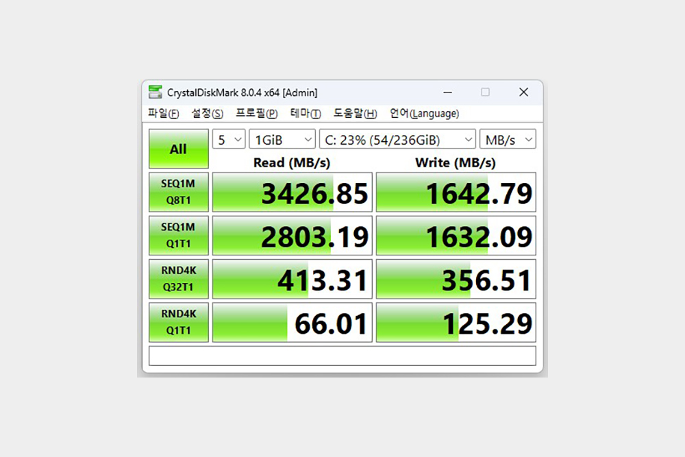 그리고 마이크로소프트 서피스 랩탑5에는 256GB 용량의 NVMe SSD가 탑재되었고 속도도 빠른 편입니다. 역시 용량이 부족하다고 생각되는 분들은 구매 단계에서 변경하는 것이 좋을 것 같습니다.