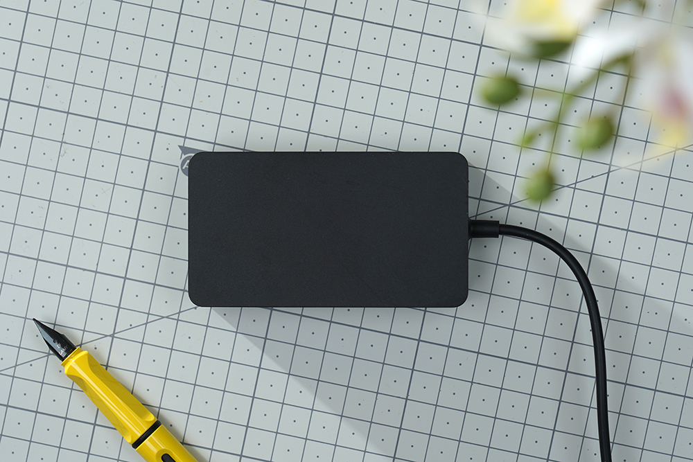 바닥을 살펴보면 모서리 부분에 고무 지지대가 배치되어 있어서 책상 위에서 잘 미끄러지지 않도록 도와주는 역할을 하고 위쪽에는 발열 해소에 도움을 주는 통풍구가 준비되어 있습니다.