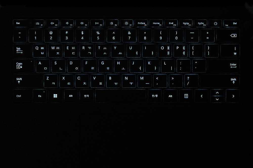 마이크로소프트 서피스 랩탑5의 키보드는 알칸테라(Alcantara) 소재로 마무리되었습니다. 부드러운 느낌을 제공한다는 장점이 있지만 사용자에 따라서 호불호가 갈릴 수 있습니다. 그리고 야간에도 작업을 할 수 있도록 키보드에는 백라이트가 탑재되었습니다.