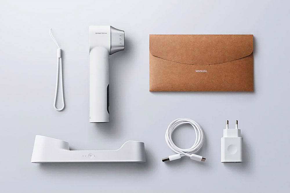 LG 프라엘 더마쎄라(BLQ1)의 구성품을 살펴보면 본체와 매뉴얼 그리고 거치대, 충전 케이블과 어댑터로 구성되어 있습니다. 마지막으로 손에서 떨어지는 것을 방지해주는 스트랩도 포함되어 있습니다.