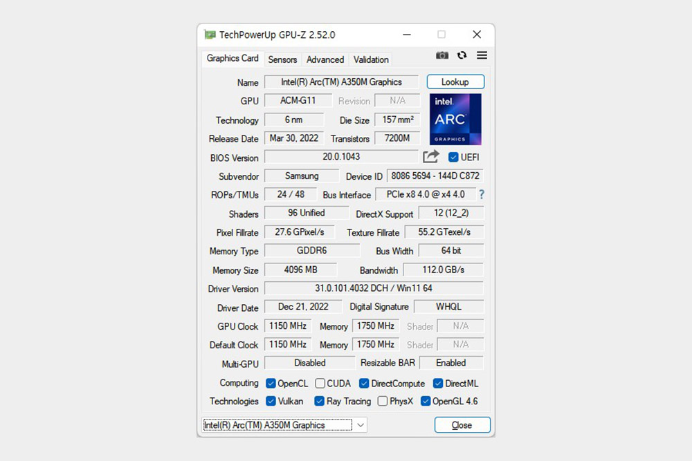 그리고 삼성전자 갤럭시북2 프로에는 인텔® Arc™ A350M 외장 그래픽카드가 탑재되었습니다. 그래서 내장 그래픽카드를 탑재한 제품과 비교해서 나은 성능을 보여줍니다. 3DMARK를 이용해서 성능을 확인해 보면 파이어 스트라이크(Fire Strike) 점수는 7000점, 타임 스파이(Time Spy)는 3315점으로 측정되었습니다.