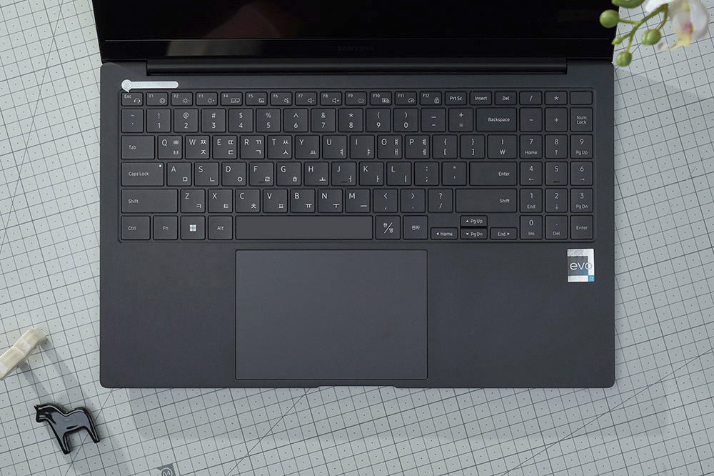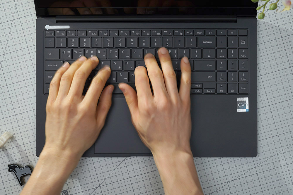 삼성전자 갤럭시북2 프로의 키보드 키감은 깔끔한 느낌을 주는 편입니다. 그래서 장시간 타이핑을 해도 크게 피로할 것 같지는 않습니다. 그리고 클릭 패드는 큼지막한 편이어서 사용하기 편리합니다.
