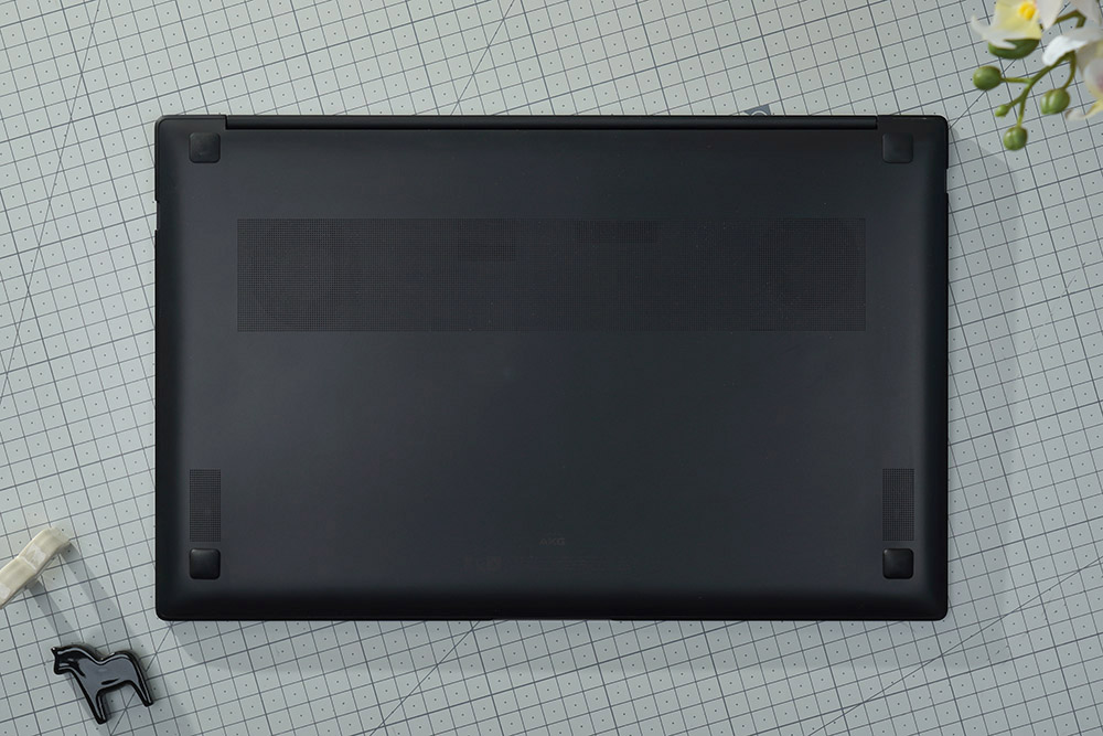 바닥을 살펴보면 모서리 부분에 고무 지지대가 배치되어 있어서 책상 위에서 잘 미끄러지지 않도록 도와주는 역할을 합니다. 그리고 발열 해소에 도움을 주는 통풍구도 준비되어 있습니다.