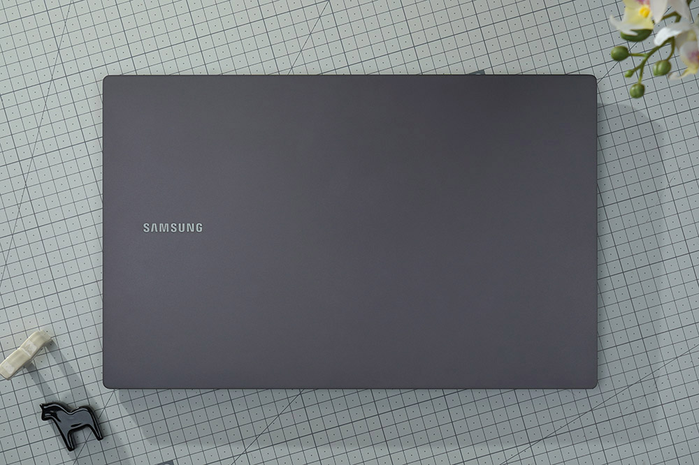삼성전자 갤럭시북2 프로는 세련된 느낌의 그라파이트 색상으로 제작되었습니다. 그래서 직장인이나 대학생이 사용해도 부담스럽지 않으리라고 예상합니다. 그리고 왼쪽에 세련된 디자인에 포인트가 되는 삼성전자의 로고가 배치되어 있습니다.