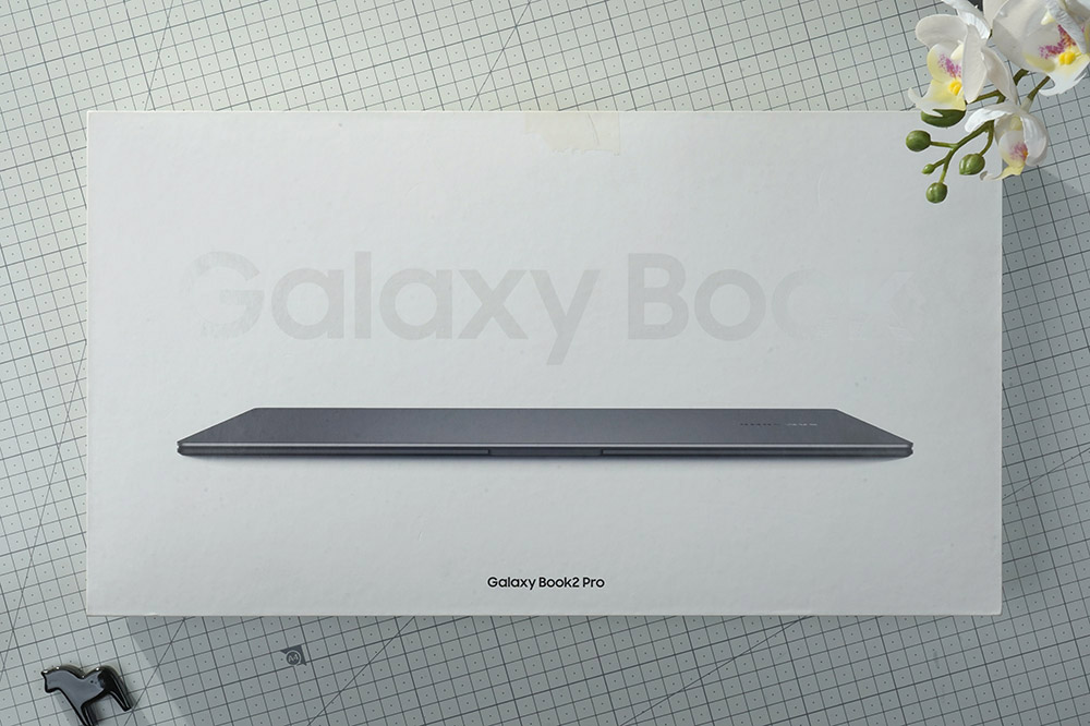 삼성전자 갤럭시북2 프로의 박스는 세련된 화이트 컬러로 디자인되었고 전면에는 Galaxy Book2 Pro라는 문구와 함께 초슬림 디자인을 형상화하는 일러스트가 인쇄되어 있습니다.