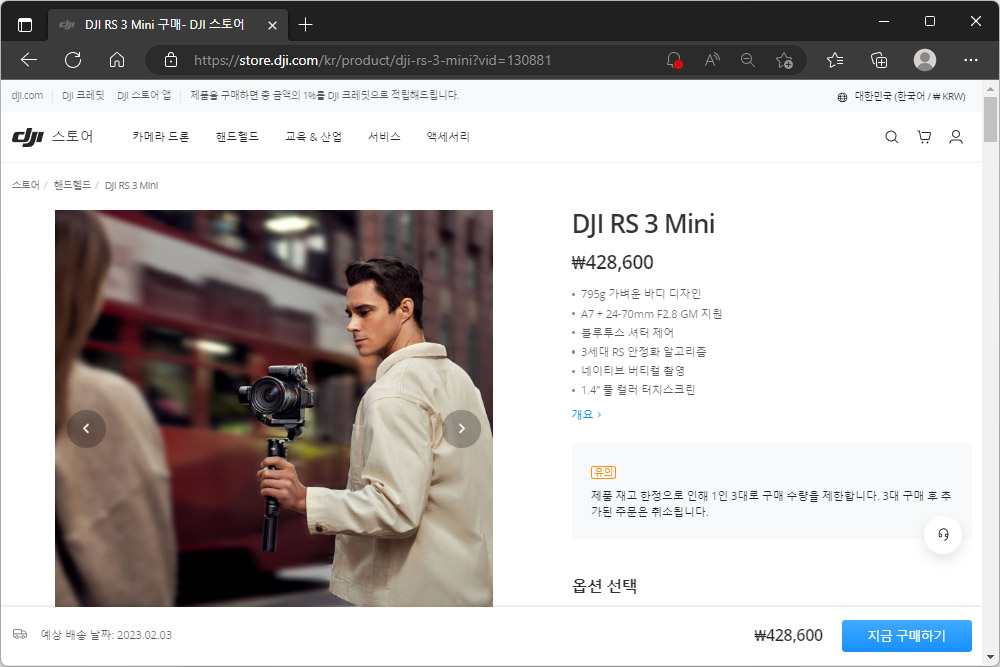 DJI RS 3 미니 짐벌의 가격을 살펴보면 기본 제품은 428,600원으로 책정되었습니다. 그리고 고음질 오디오 녹음 기능을 지원하는 DJI 마이크를 포함한 DJI RS 3 Mini 크리에이터 콤보는 879,800원입니다. 생각보다는 저렴한 편이라고 판단되었습니다.