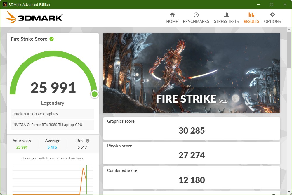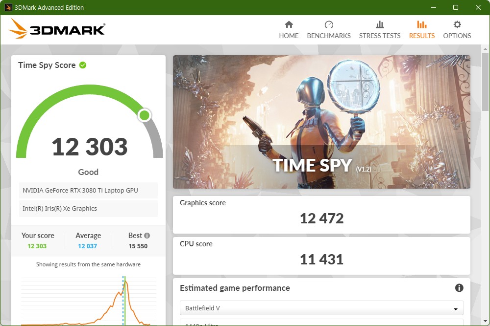 델 에일리언웨어 X15 R2 WP09KR에는 NVIDIA 지포스 RTX 3080 Ti 16GB 그래픽 카드가 탑재되었습니다. 3DMARK(3d마크)를 이용해서 성능을 확인해 보면 FIRE STRIKE(파이어 스트라이크)는 25991점, TIME SPY(타임 스파이)는 12303점으로 측정되었습니다.