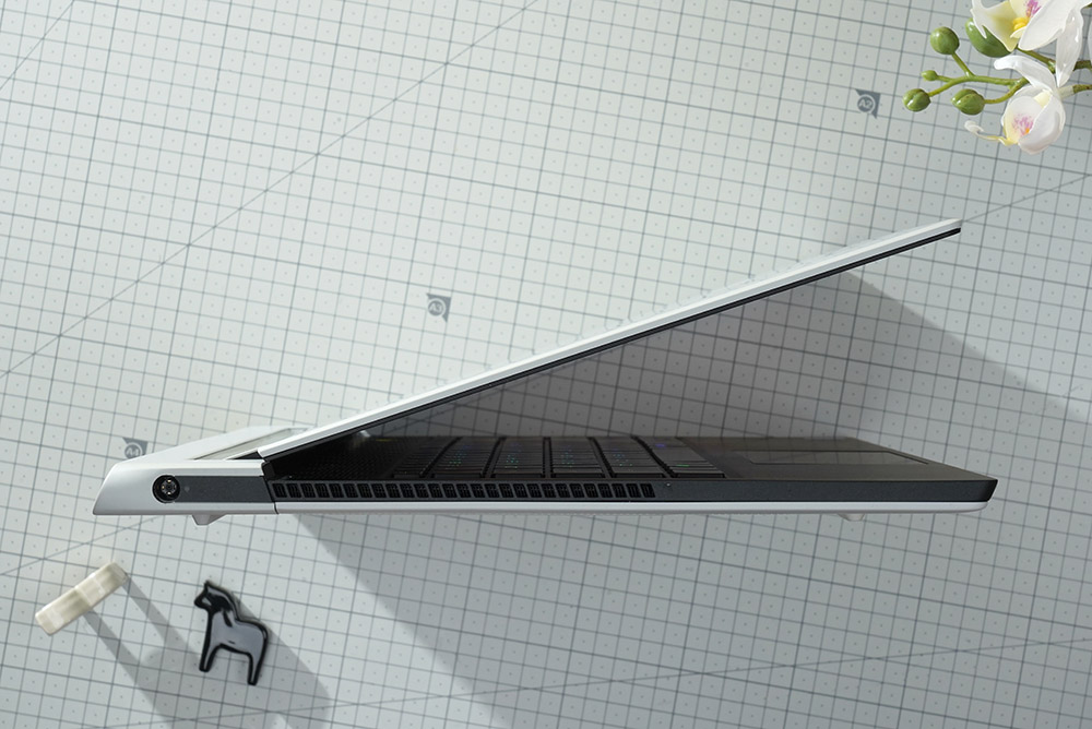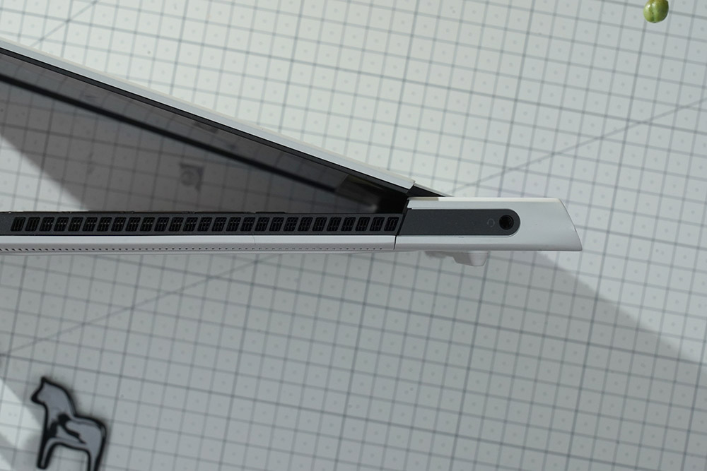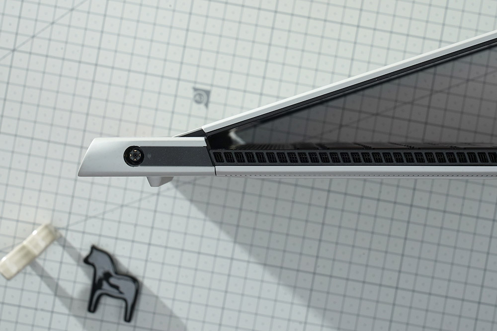 델 에일리언웨어 X15 R2 WP09KR의 단자들을 확인해 보면 왼쪽에는 전원 입력과 오른쪽에는 3.5mm 헤드셋 잭이 배치되어 있습니다. 온전하게 게임에 집중할 수 있도록 측면에 어떤 확장 포트도 배치하지 않았다고 합니다. 그래서 책상을 조금 더 깔끔하게 정리할 수 있습니다.