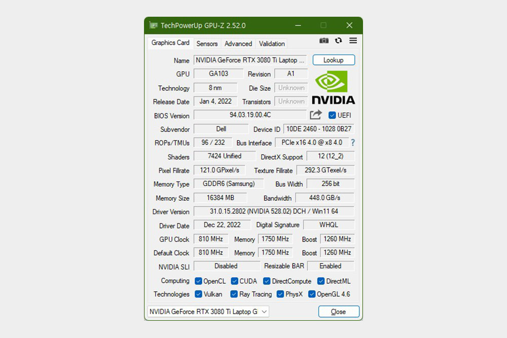 그리고 델 에일리언웨어 X15 R2 WP09KR에는 2세대 레이 트레이싱과 AI 가속 성능(NVIDIA DLSS)을 지원하는 NVIDIA 지포스 RTX 3080 Ti 16GB 그래픽 카드를 탑재했습니다. 그래서 관련 게임들을 더욱 사실적인 그래픽으로 플레이할 수 있습니다.