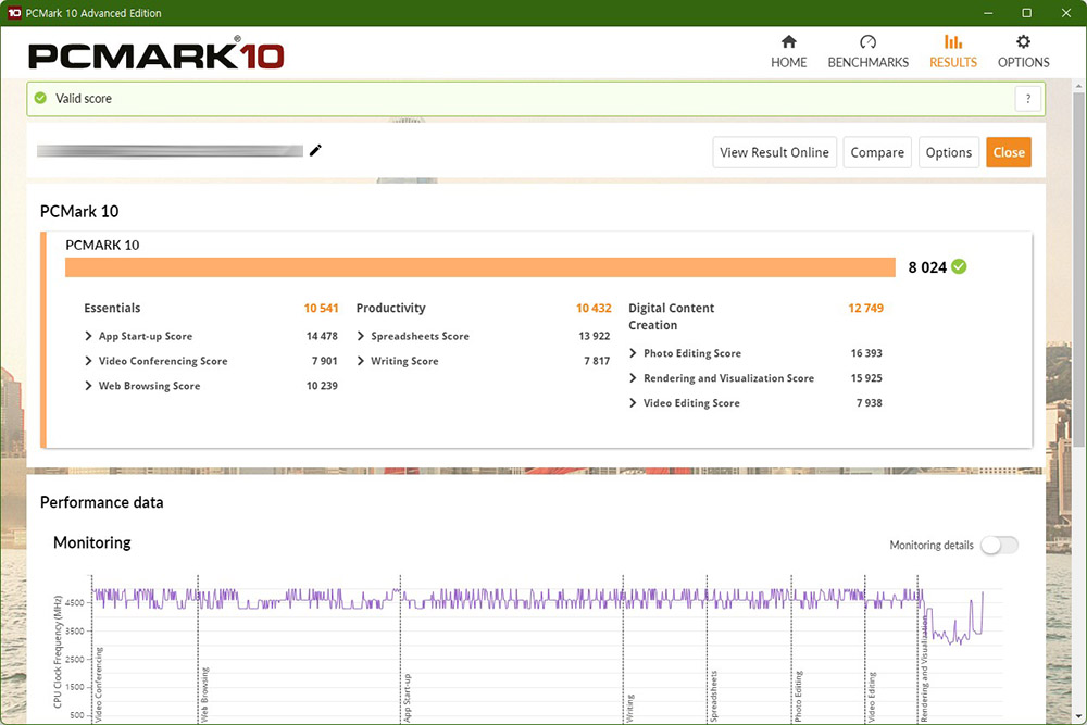 마지막으로 노트북의 전반적인 성능을 평가해주는 PCMARK10의 점수는 8024점으로 측정되었습니다. 델 에일리언웨어 X15 R2 WP09KR의 성능은 최고 수준이라고 판단되었습니다.