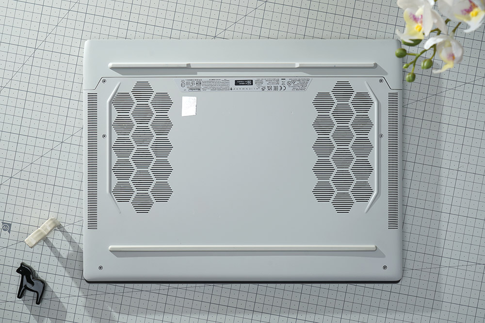 바닥을 살펴보면 위아래에 기다란 형태의 고무 지지대가 배치되어 있어서 책상 위에서 잘 미끄러지지 않도록 도와주는 역할을 합니다. 그리고 4개의 고성능 쿨링팬으로 구성된 Alienware Cryo-Tech 냉각 기술이 적용되었습니다. 실제 게임을 플레이할 때 온도는 사용기의 아래쪽에서 확인할 수 있습니다.