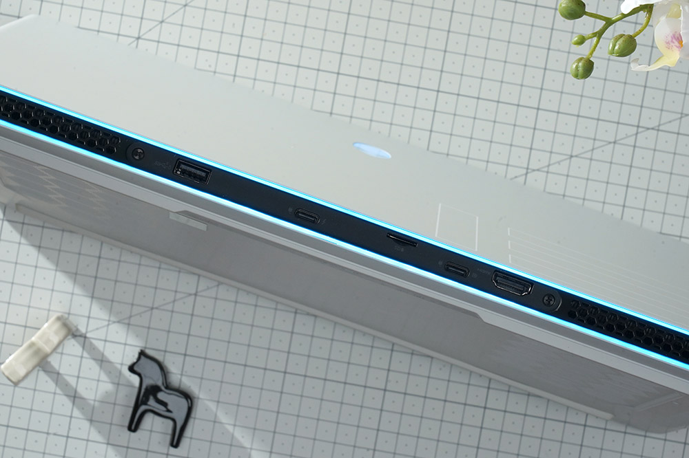 델 에일리언웨어 X15 R2 WP09KR의 뒷면을 살펴보면 1680만 컬러를 표현할 수 있는 AlienFX RGB Rear Loop가 배치되어 있습니다. 그리고 안쪽에는 왼쪽부터 USB 3.2와 한 개의 포트로 8K급 디스플레이나 다중 4K 디스플레이를 연결할 수 있는 것은 물론이고 USB 3.1보다 4배 더 빠르게 파일을 전송할 수 있는 썬더볼트™4 인터페이스 그리고 마이크로SD 카드 슬롯, USB-C, HDMI 2.1 포트가 배치되어 있습니다. 확장성은 준수한 수준이라고 생각되었습니다.