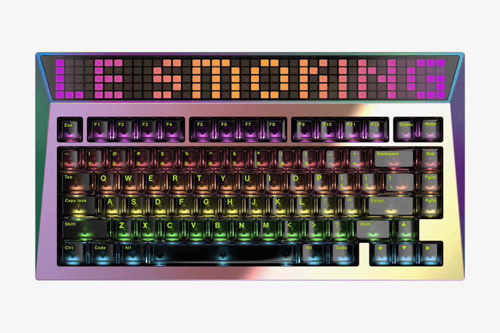 AngryMiao 사이버보드 R2 커스텀 키보드의 색상은 사이키델릭(Psychedelic)과 제트 블랙(Jet Black) 그리고 메테오 그레이(Meteor Gray) 3가지 중에서 선택할 수 있습니다. 전체적으로 화려함이 장점인 제품이기 때문에 저는 사이키델릭이나 제트 블랙을 선택하는 것을 추천합니다. 참고로 75% 배열로 제작되어서 기능키(F1~F12)가 존재합니다.