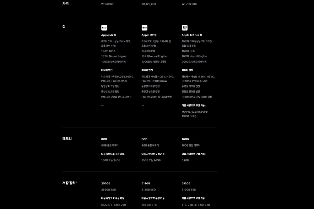 애플 맥미니 2023의 가격을 살펴보면 M2 칩/8GB 메모리/256GB 저장 장치 모델의 경우에는 85만원, M2 Pro 칩/16GB 메모리/512GB 저장 장치 모델의 경우에는 179만원으로 책정되었습니다. 자신의 작업 패턴에 따라서 제품을 선택하는 것이 좋을 것 같습니다.
