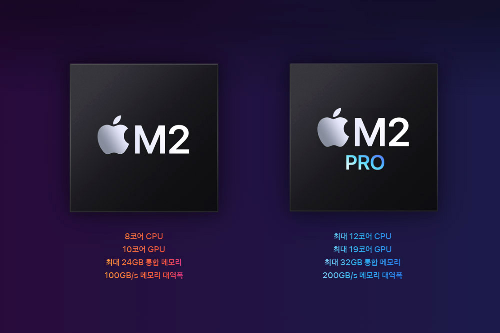 애플 맥미니 2023은 M2와 M2 프로 칩 두 가지 모델로 출시되었습니다. 각각의 제품은 8코어의 10코어(최대 12코어)의 CPU와 10코어 16코어(최대 19코어)의 GPU로 구성되어 있습니다. 그리고 모두 ProRes 인코딩 및 디코딩 엔진을 탑재하고 있다는 특징이 있습니다.