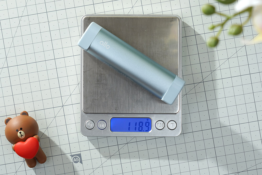 그리고 무게는 약 118.9g으로 측정되었습니다. 배터리가 내장된 제품의 특성상 크기에 비해서 제법 묵직하다는 느낌을 받을 수 있습니다. 그리고 떨어트리면 테두리 부분이 크게 파손될 수 있으니 주의하시길 바랍니다.