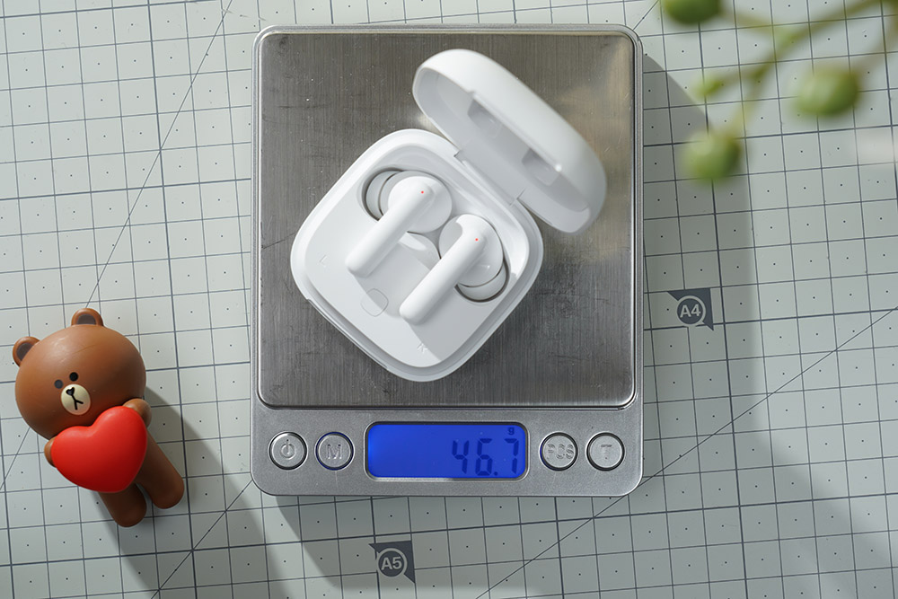 QCY T13 ANC 블루투스 이어폰의 무게는 약 46.7g으로 측정되었습니다. 전체적으로 휴대하는데 크게 신경이 쓰일 것 같지는 않았습니다. 그리고 충전 케이스의 표면은 매트한 느낌으로 마무리되었고 아마도 흠집에는 취약할 것으로 예상합니다.