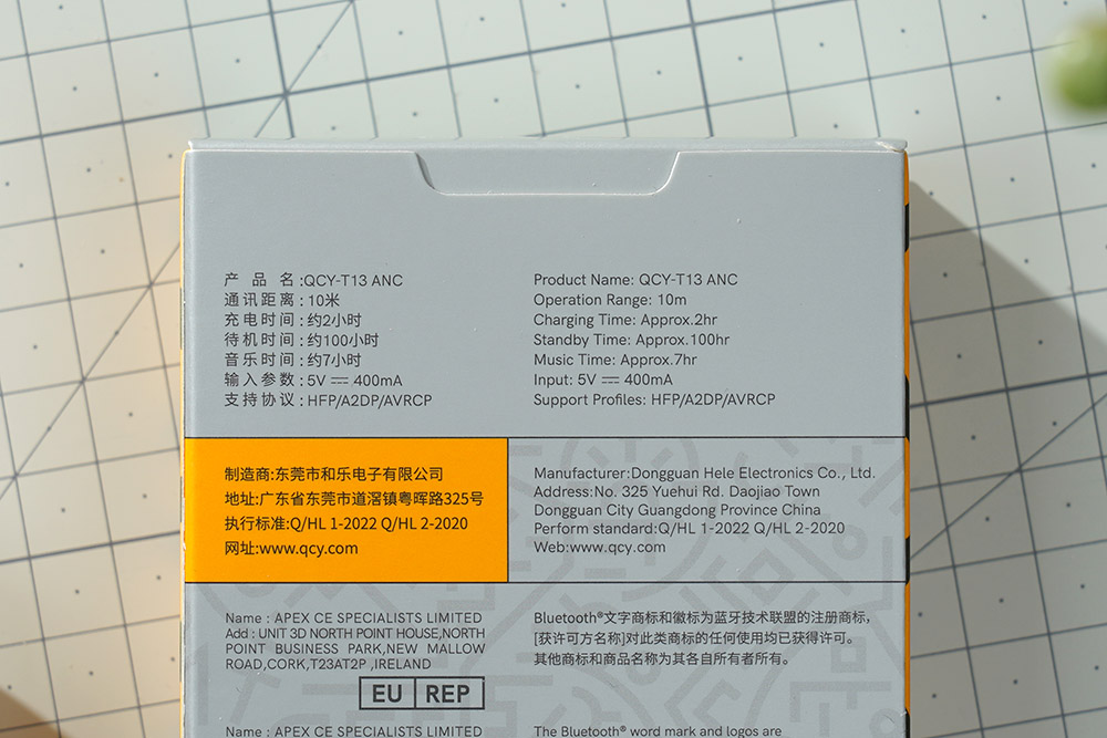 박스의 뒷면에는 QCY T13 ANC 블루투스 이어폰의 스펙이 표시되어 있습니다. 사용 거리는 약 10미터이고 충전 시간은 2시간 그리고 약 100시간 정도 대기할 수 있습니다. 그리고 노이즈 캔슬링 기능을 끈 상태에서 약 7시간 정도 음악을 들을 수 있습니다. 참고로 블루투스 5.3을 채택했고 지원 프로토콜은 HFP / A2DP / AVRCP입니다.
