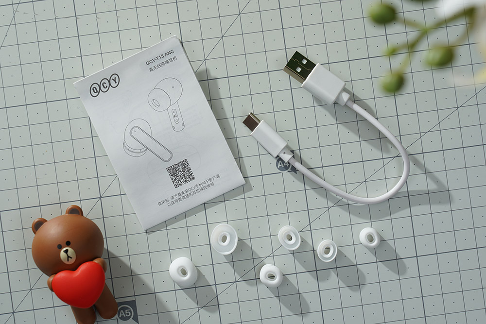 QCY T13 ANC 블루투스 이어폰의 구성품을 살펴보면 설명서와 총 3쌍의 이어팁 그리고 USB-C 충전 케이블이 포함되어 있습니다. 기본으로 장착된 것까지 포함하면 총 4쌍의 이어팁이 제공된다는 점이 독특한 부분이라고 생각되었습니다. 그리고 3천원 정도를 추가하면 충전 케이스의 케이스를 구매할 수 있는데요. 가성비 제품이라서 그 정도의 가치가 있을지는 조금 의문입니다.